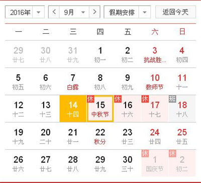 根據(jù)《國務(wù)院辦公廳關(guān)于2016年部分節(jié)假日安排的通知》和省政府辦公廳有關(guān)通知精神,2016年中秋節(jié)放假日期新鄉(xiāng)市天豐振動機械有限公司具體安排如下:9月15日至17日放假調(diào)休,共3天。9月18日(星期日)上班。