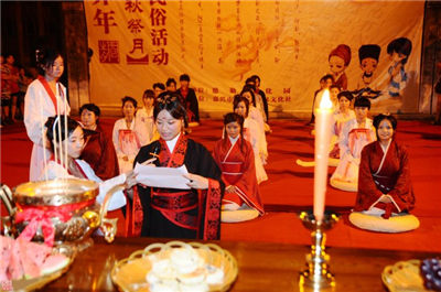 在月下,將月亮神像放在月亮的那個方向,紅燭高燃,全家人依次拜祭月亮,然后由當家主婦切開團圓月餅。切的人預(yù)先算好全家共有多少人,在家的,在外地的,都要算在一起,不能切多也不能切少,大小要一樣。